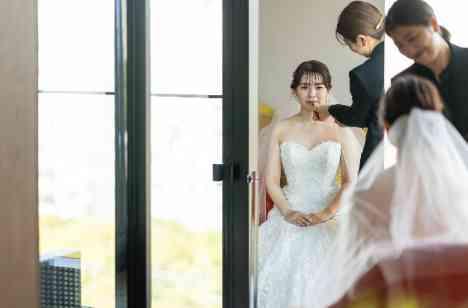 前日からはじまるTIAD ウエディング 目の前に広がる森の緑がもたらすやすらぎとともに ゆっくりとお部屋でお仕度を ご新婦様が選ばれたドレスは 流れるようなビーディングの煌めきがエレガントな一着 フィット&フレアーのドレスシルエットは 可憐でスタイリッシュな印象で 親しみやすく 可愛らしい雰囲気の新婦様にピッタリです
