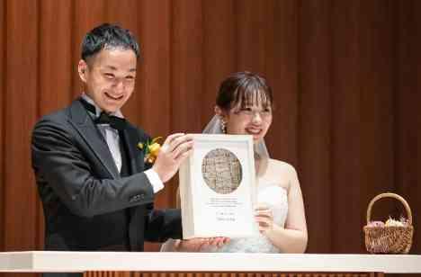 ご入場とともに春の澄んだやわらかい光がチャペルに差し込みます 家族の絆を感じ 幼少期からの想い出がよみがえるようなシーンに感動が広がります 結婚証明書は ゲストにご協力いただいた水引アートを おふたりの手で完成させるセレモニー 「人と人を結ぶ」「縁を結ぶ」という意味合いが 結婚という人生の節目にピッタリな結婚証明書です