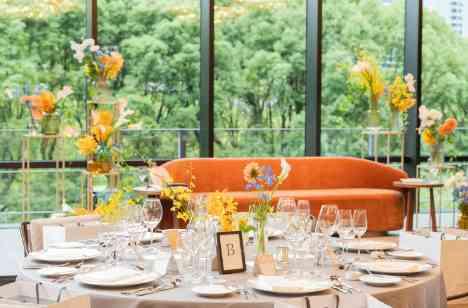 選んだ会場はモダンなQueens Room 落ち着いたバンケットのカラートーンに、オレンジやイエローの、温かみのある色合いが映え、夏の爽やかな陽光が差し込むガーデンのようなコーディネート。 ナチュラルさとエレガントな雰囲気を兼ね備え、和やかな空気に包まれた雰囲気にゲストは魅了されているようでした