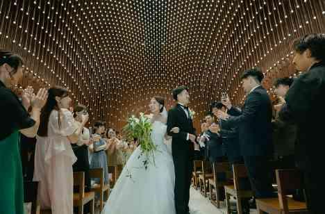 新しい人生のスタートへの期待が高まる中、 木のぬくもりと柔らかな光に包まれたチャペルに、 オルガンとバイオリンの生演奏が響き渡り、 ウエディングセレモニーが始まりました。 誓いを交わす瞬間は、これから共に歩む決意を改めて確かめる大切な時間。想いを込めた言葉は深い感動を呼び、 その気持ちはゲストの皆さまにもしっかりと届きました。