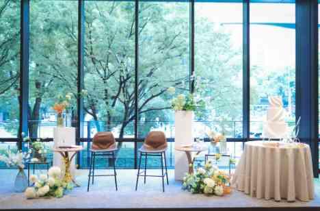 おふたりが選ばれたのは、ガラス張りの開放的な空間に自然の緑が美しく映り込むPark View North。ホワイトやグリーンを基調に、柔らかなアプリコットオレンジやイエローをアクセントに添え、可憐さと温かみが調和するナチュラルで洗練されたコーディネートが施されています。やさしい光に包まれながら、穏やかで心地よい時間がゆったりと広がる空間です。