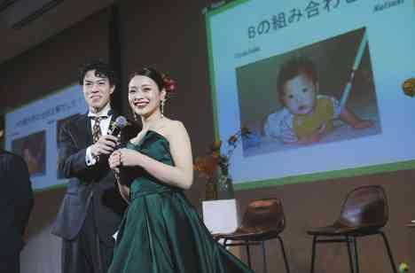 お色直しでお選びになったのは、深みのあるグリーンが印象的な一着。イタリア製のシルク混素材を使用し、胸元の立体的な折りたたみパターンが洗練されたモノマテリアルデザインを際立たせます。美しく広がるタックスカートと後あきのカシュクール仕立てが、クラシカルさとモダンさを絶妙に融合。華やかで上品な装いは、ゲストとの楽しいひとときにもひときわ映え、会場に彩りを添えました。