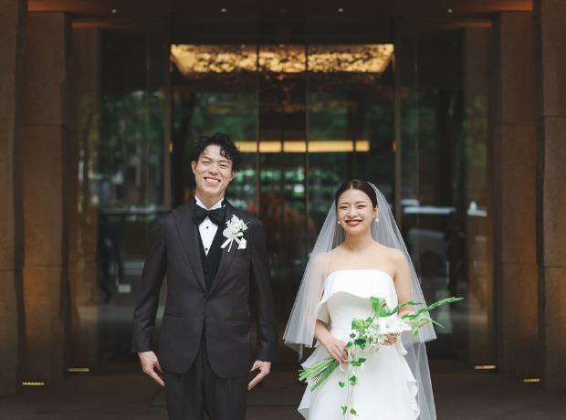 おふたりが選ばれたのは、ガラス張りの開放的な空間に自然の緑が美しく映り込むPark View North。ホワイトやグリーンを基調に、柔らかなアプリコットオレンジやイエローをアクセントに添え、可憐さと温かみが調和するナチュラルで洗練されたコーディネートが施されています。やさしい光に包まれながら、穏やかで心地よい時間がゆったりと広がる空間です。