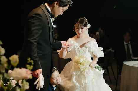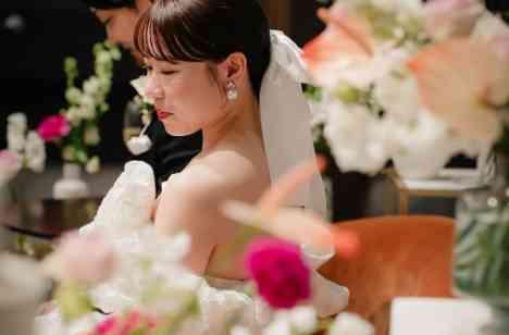 空間に寄り添うように選ばれたのはフラワーオーガンジージャガードレースの華やかなウエディングドレス。繊細なグラデーション刺繍が花々と響き合い、立体的なモチーフがやわらかな存在感を放ちます。可憐さと上品さが調和し、特別な一日をより印象深く彩りました。大切な皆さまと過ごすひととき、愛らしい存在へ注がれるやさしいまなざしが重なり、会場はあたたかな空気に包まれます。