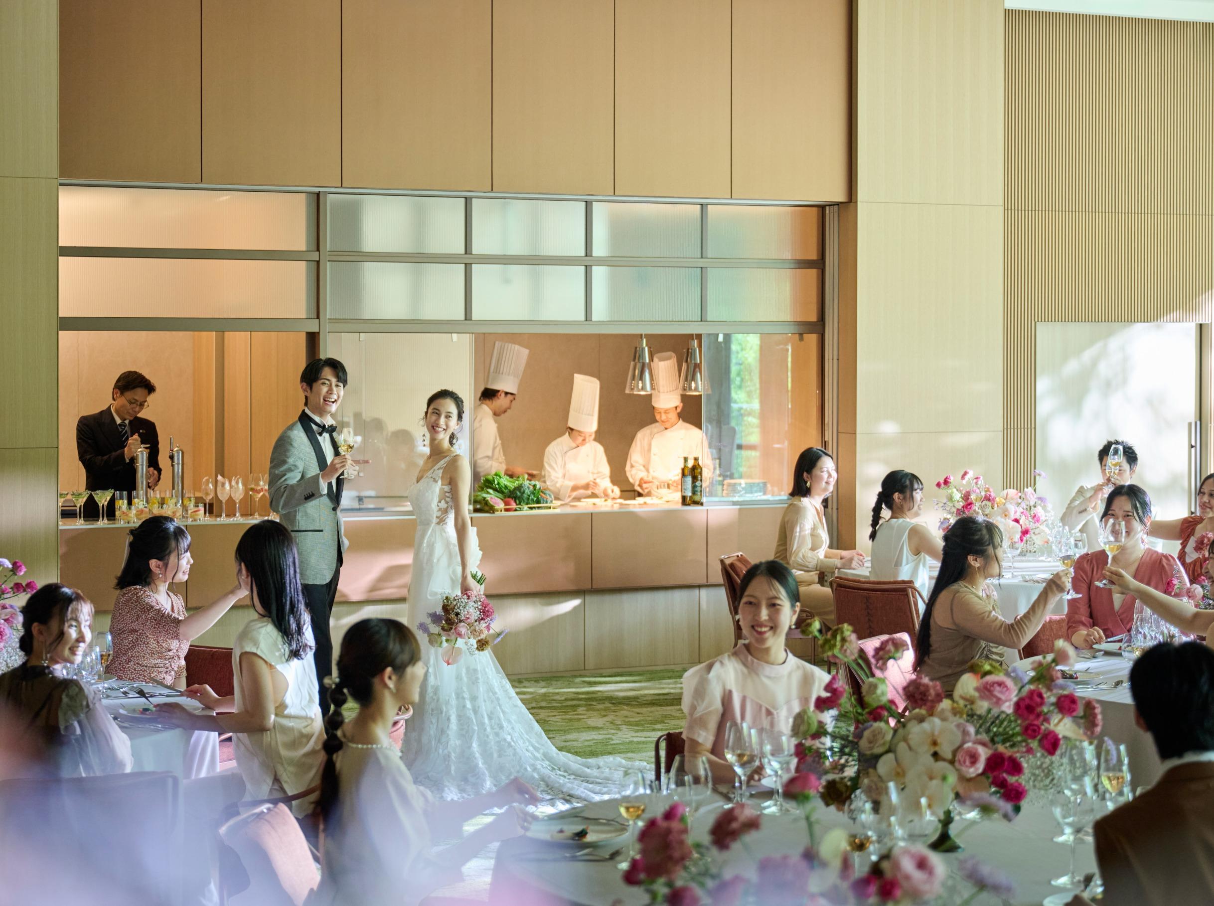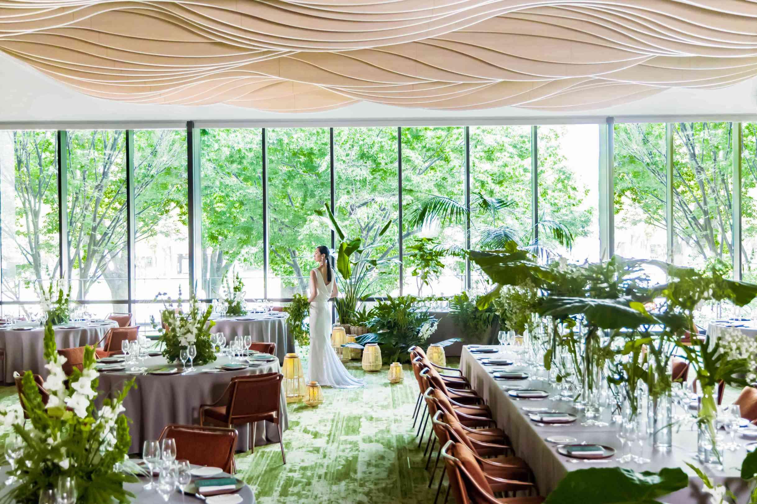 フロア貸切できるパーティ会場は全3タイプ。どこを選んでも窓一面に緑が広がり、パークフロントならではの美しい景観がゲストを迎える。オープンキッチンから食欲を誘う香りが漂い、華やかな祝宴を期待させる