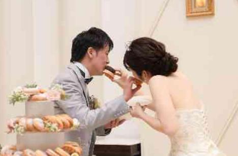 よく見るウェディングケーキでのセレモニーではなく 少し違う形でセレモニーをしたいとのことだでしたのでドーナツタワーをご用意してセレモニーを行いました。 当初は 1つずつドーナツを食べて頂く予定でしたが新郎様のご友人様に促され 新郎様には2つのドーナツを召し上がって頂きました。 ゲスト様から笑い声が聞こえてくる笑顔が広がるお時間になりました。