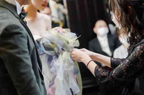 挙式ではゲスト全員に参加頂けるハンドファスティングセレモニーを行いました。1人1本リボンをお持ち頂き、誓いの問いかけやお祝いのメッセージと共に新郎新婦の繋いだ手に結んで頂きます。満面の笑みや思わず溢れる涙などたくさんの感情に包まれるお時間でした。どんどん大きくなっていくリボンの結び目は、ゲストから新郎新婦への祝福や未来へのエールを表しているようでした。