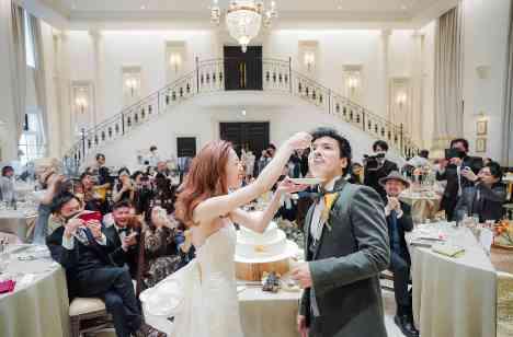 ケーキセレモニーのひとコマ。おふたりの表情はもちろんゲストの表情も見どころです。こちらのケーキのお仕上げは披露宴中に新郎新婦自ら行いました。テーマカラーの中からそれぞれお相手に贈りたい言葉のカラーを選んでカラーバターで完成。お料理もオリジナルだからこそ、おふたりらしさが叶うトータルコーディネートです。