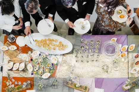 挙式と披露宴の間では、おふたりからのおもてなしの時間ウェルカムパーティーを行いました。お料理を食べるもよし!お酒を飲むもよし!お写真を撮っても…とにかくおふたりとの時間を皆様が楽しんでくださっておりました。ウェルカムパーティーのコーディネートも専属のフラワーコーディネーターがさせて頂き、テーマカラーの6色で華やかにお飾り致しました。
