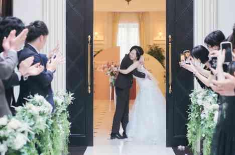 【挙式退場時におふたりで幸せのハグ】 挙式退場時にクローズキスなどもありますが、お2人は扉クローズ時に幸せのハグ! お2人の幸せをゲスト全員が祝福する最高の時間になりました。 何より挙式後のお2人の幸せの表情が印象的でした。 そして、扉がクローズした後の挙式会場内も幸せな表情でいっぱいでした。ぜひ、参考にしてみてください。