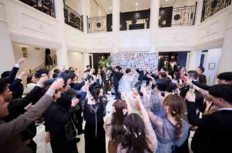 挙式後はフォトボードがある、ロビーでゲスト全員と「乾杯!!!」大盛り上がりな中リラックスして望めました。その後はフォトボード前でゲストとゆっくり写真撮影を楽しみました!またゲスト全員とゆっくりと会話をする時間がとれたので、感謝の気持ちを一人一人に伝えることができ、笑顔が溢れる楽しい時間を過ごすことができました。