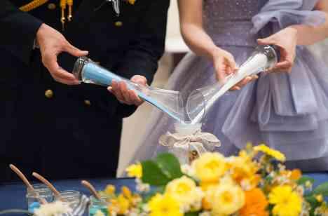 演出はテーマに合わせてサンドセレモニーをしました。ゲストの方々にも参加して頂けるように、受付で砂を入れてもらい、進行の中で登場して頂く方々にも砂を入れてもらいました。テーマに合わせたお洒落な素敵な演出となりました!