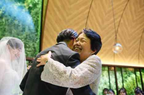 1輪1輪意味のあるバラをご新郎様へ託し、ご新婦様へ改めてプロポーズを行うダーズンローズセレモニーを行った挙式のお時間。性格が真逆だけれどなぜか相性が良いというおふたりの打合せ中の言葉から、きっとゲストの皆様も十人十色、でもそんなゲストの皆様に支えられて今日があるということを感じていただきたいと思いご提案。 12本目のバラはご新郎様のお母様に届けていただき生まれた熱いハグは心が温まりました。