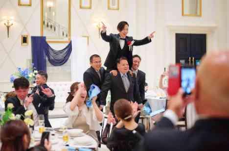 弟様のご結婚式でも兄弟で騎馬を組んでご中座したというご新郎様。これを一家の伝統にしていきます!ということで中座相手にはご兄弟様をお選びになりました。 ご兄弟からご新郎様へ向けたあたたかいお時間の後に騎馬を組んで中座していくご様子はゲストの皆様も思わず手をたたいて笑ったり、ナフキンをクルクル回したり、会場全体が大盛り上がりな最高にHappyなお時間になりました。