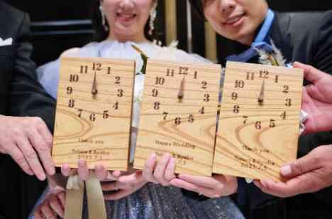 親御様への記念品を悩まれていたため、人と人との繋がりをたいせつにしているおふたりだからこそ記念品もご家族との結びつきを表す三連時計をご提案いたしました。 結びのお時間で司会者から意味合いを説明したあとに3つの時計が繋がった瞬間は心温まるお時間となりました。 今日の日をいつまでも思い出せるようなそんな思いであふれる記念品になっていたら嬉しいです。