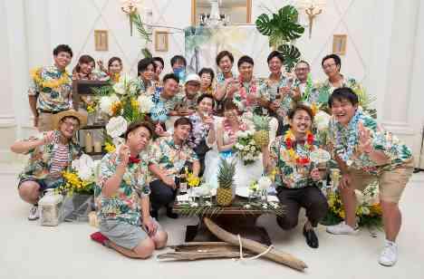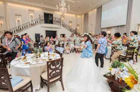 新婦様がフラダンスがお好きだったので、講師の先生にレクチャーをしてもらいながら、全員でフラダンスの時間を設けました。ゲストにもアロハシャツやムームーをドレスコードとして着ていただいていたので、楽しくHAWAIIの雰囲気を感じていただけました。