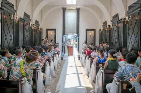 ゲストに少しでもHAWAIIの雰囲気を感じていただけるように挙式の生演奏もウクレレ奏者に変えて、新婦様の思い入れのあるHAWIIの曲で演奏してもらいました。バージンロードに砂も引き詰めてお二人にはお揃いのスニーカーで楽しくご登場してもらいました。