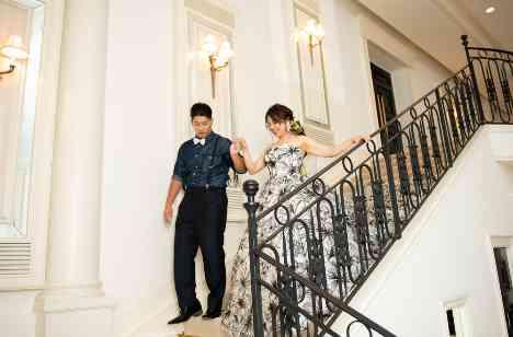 新婦様のお気に入りのカラードレスで階段からご入場頂きました。映画のワンシーンのように、新郎様にエスコートしてもらいながら素敵な入場演出となりました。ゲストの方々にもたくさんお写真や映像に残して頂きました。