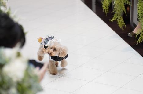 挙式ではお二人の大切な愛犬がリングドックとして、指輪を運んできてくれました。大切な結婚証明書には、肉球で署名をしていただき和やかな挙式となりました。挙式後には、お二人と愛犬でガーデン撮影も行いました。
