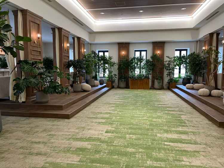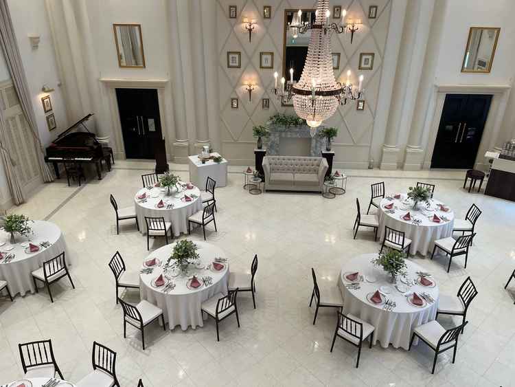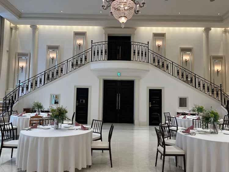 写真通りの明るく、天井高もあり素敵な会場です。披露宴会場にある両階段も写真映えがするので素敵だと思いました。階段で演出したい方にはオススメだと思います!