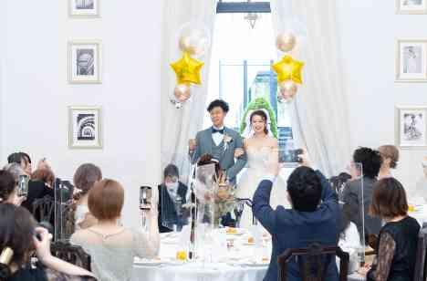 おふたりのテーマであるスターのバルーンをもって披露宴入場!楽しい雰囲気での入場をご希望のお2人でしたの画、光が差し込むガーデンからのご入場がとっても素敵でしtあ!ゲストからも歓声が上がり、披露宴のスタートからとっても盛り上がりました! スターバルーンはメインソファの装飾としてもお飾りしましたので、ゲスト様とのお写真もとっても映えました。