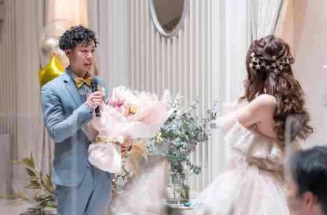 お仕事がいそがしく、ご結婚式準備にあまり協力できなかったと仰せの新郎様から、感謝の気持ちを込めて新婦様へ花束のご贈呈とお手紙のプレゼントをなさいました。新郎からは普段伝えることができない感謝の気持ちと、これから幸せにしていきたいう思いを伝えられ、新婦様の目には涙が。たいせつなゲストの前で誓うからこそ、より愛があふれる暖かい時間となりました。