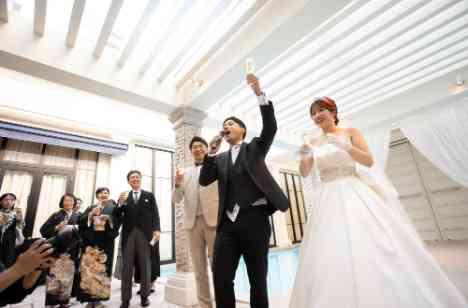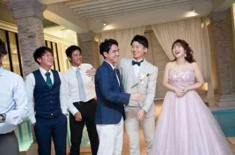 堅苦しくなくアットホームに過ごしたいお二人。 乾杯もご友人様に行ってもらうことになり、お気に入りのプールサイドでの乾杯をご提案。 ガーデンでお2人を囲って頂き、挙式後の乾杯後はご親族様ご友人様ともに思い思いにお話され過ごされておりました。 堅苦しくないアットホームな雰囲気から披露宴がスタートしました!