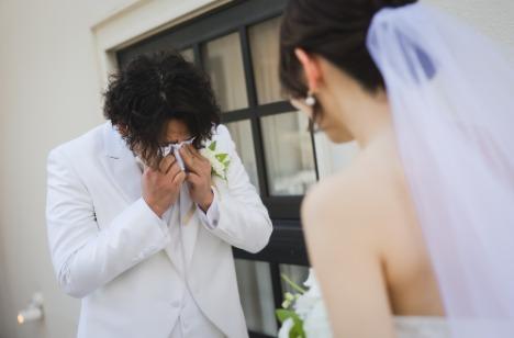 挙式前に大好きなお互いへサプライズでスタートして1日。新郎様から新婦様へは、普段照れくさいけど大好きな想いをバラの花束でプレゼント。新婦様からは、こっそり書き留めた新郎様へのありがとうの気持ちを手編みに綴り読んでから、新婦様と対面。手紙を読みながらこらえていた涙が、新婦様とファーストミートをした瞬間、暖かい言葉に想いがこみ上げ、大号泣の新郎様でした。お互い泣き笑いしながら、1日のスタートです。