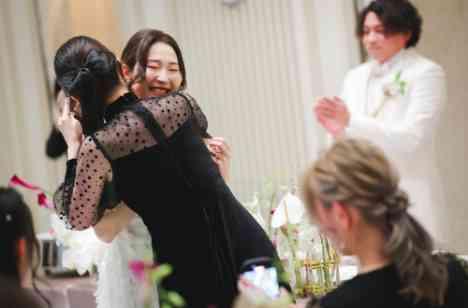 新婦様の中座は、大好きなお姉様と。サプライズで呼ばれたお姉さま。照れながらも、小さいころの話や姉妹にしかわからない、思い出ににやけながら聞いていた新婦様。おめでとうという気持ちが思わず現われたハグ。その様子を見ていたご両親様も嬉しそうに、涙を浮かべていらっしゃいました。中座をする際は、新婦ご両親のテーブルの近くをまわり、おめでとうと声をかけてもらいながら、笑いあり涙ありのご中座となりました。