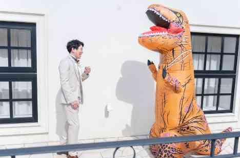 まさか、まさかのファーストミートでした。前方を向いている新郎様の肩をトントンとし、振り向いた瞬間に恐竜に包み込まれた新婦様が!予測したいた何倍もの衝撃に、笑いと驚きが隠せない様子でスタッフも一緒に大盛り上がりしました。その後、恐竜の中から素敵なドレス姿の新婦様がご登場され、記念にお写真撮影も行いました。