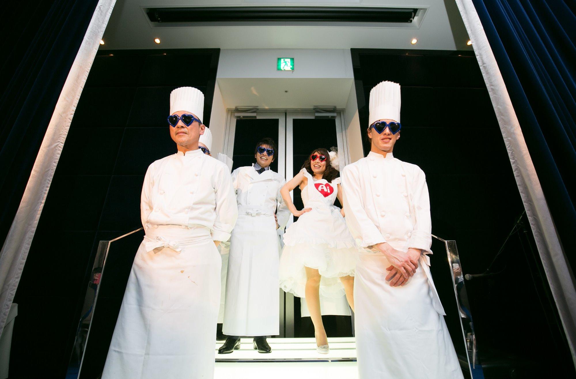 関西圏外のゲストが多かったので、ウェルカムパーティでたこ焼きを出したら大好評でした。お料理を重視していることがゲストに伝わるよう、コックコートを着た新郎のフランベ演出、エプロンを着た新婦のお料理盛り付けをして、2人で作った料理を、両親に運びました。とても喜んでくれました!再入場のお色直しをウエディングドレスのミニバージョンにしました。かわいいし珍しいし大好評でした!
