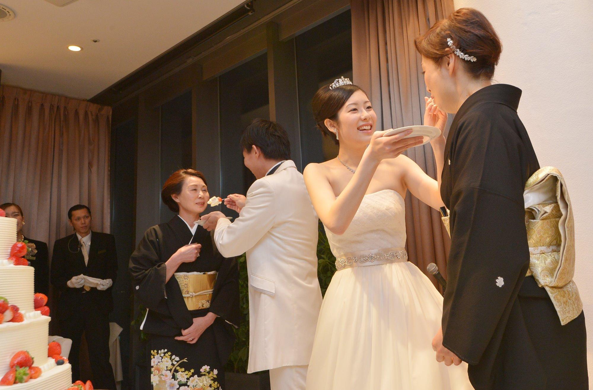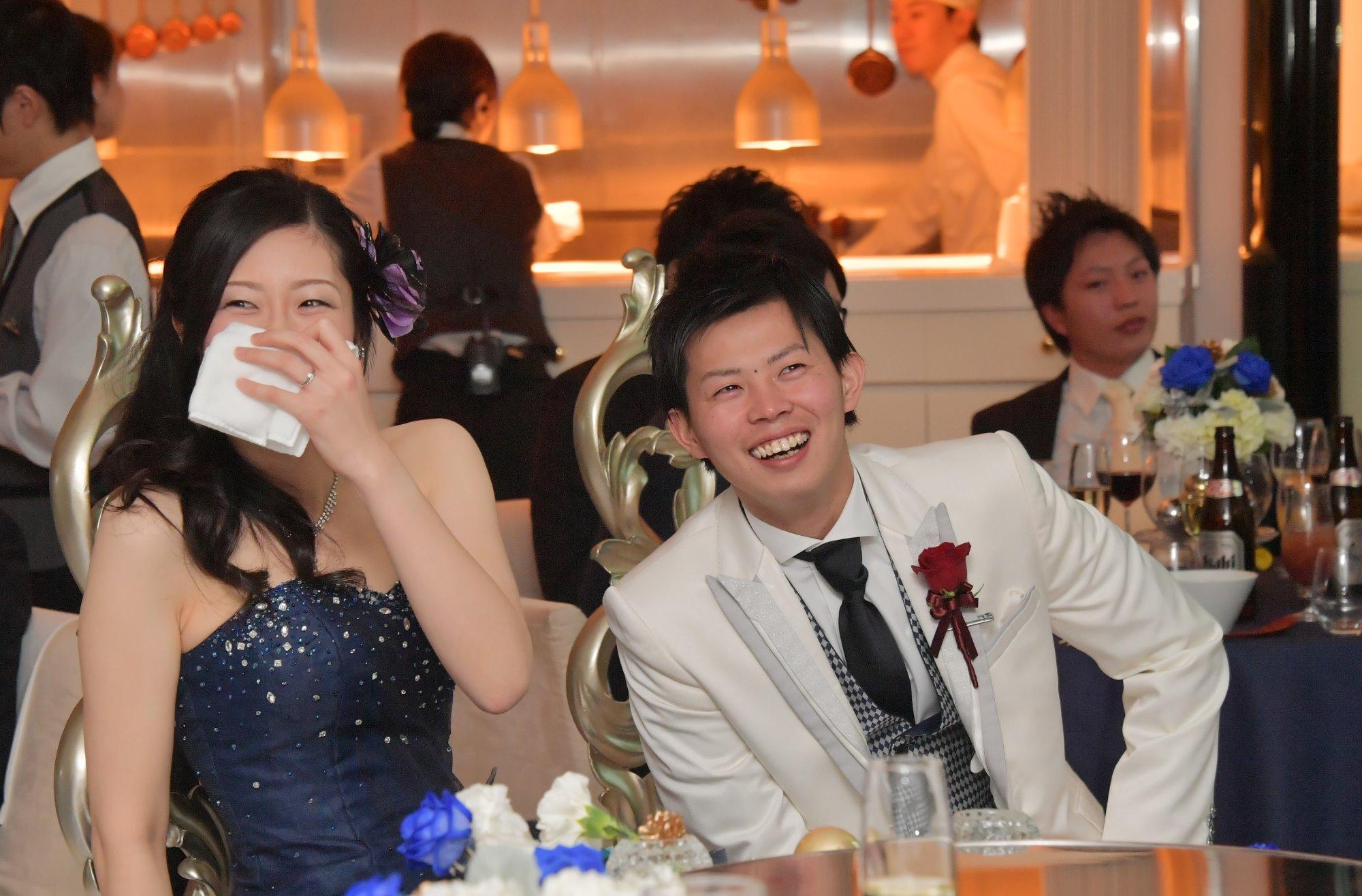 ケーキ入刀の際にラストバイトを取り入れ、互いの母親に今までおいしいご飯を作ってくれてありがとうと感謝の意を表すことで、自立心が芽生えたことは良い思い出となりました。司会の方に私たちの面白いエピソードを紹介してもらい、ゲストに笑ってもらえる時間を多く作るようにしました。またお互いの好きな色が青なので、披露宴会場の装飾は青を基調、衣装にも青を取り入れるなど、かっこいいをテーマとした青にこだわりました。