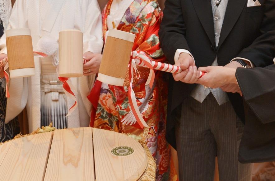特に凝った演出はおこないませんでしたが、お色直しでせっかく色打掛・紋付き袴を着たので鏡開きを行いました。 外国人のゲストも、大きな日本酒の酒樽に興味津々でした!残ったお酒も式が終わった後にお部屋に持ってきていただけたので、式の思い出に浸りながらお友達と楽しむことができました。