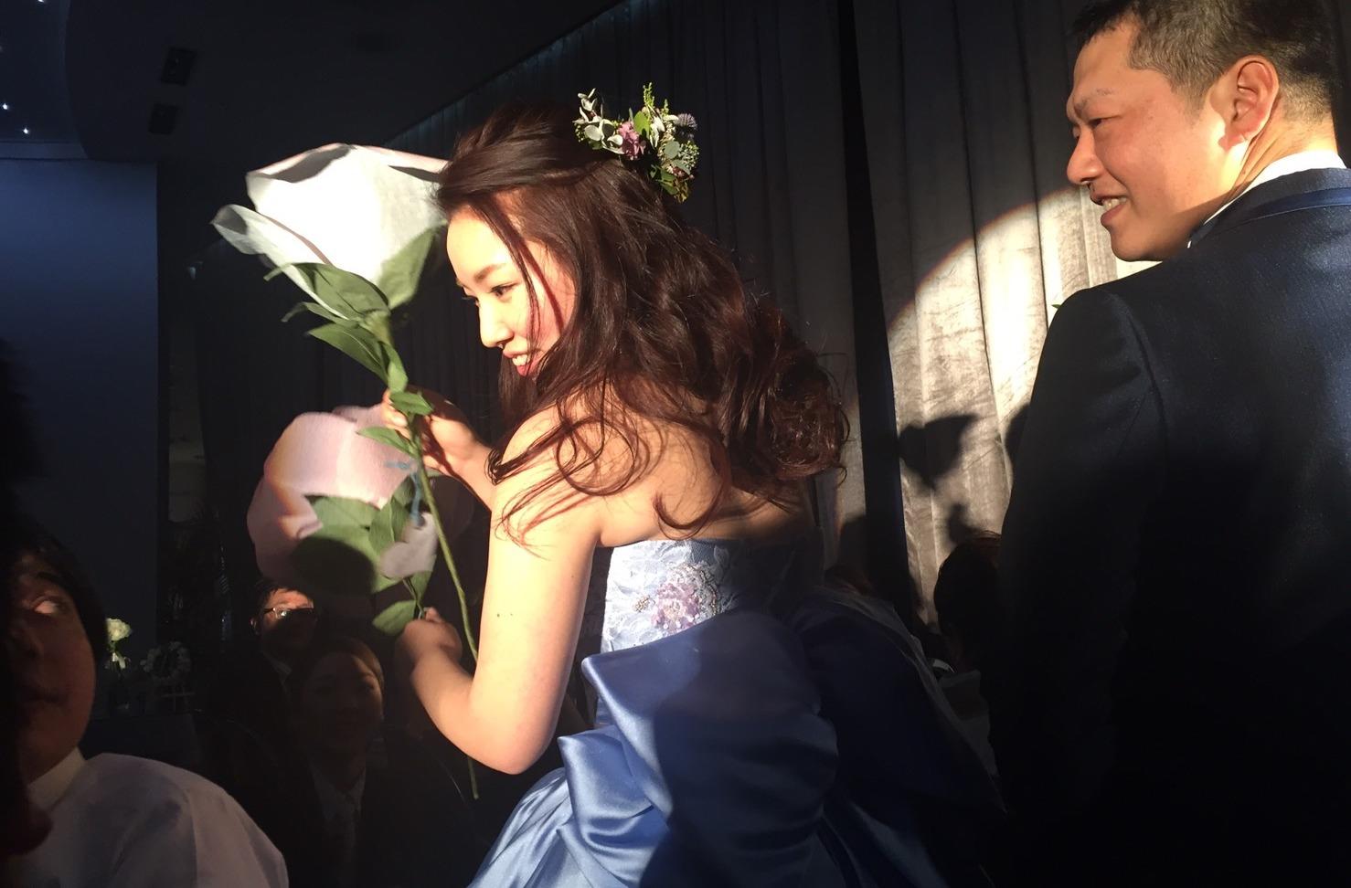 お金のかからない演出を、という希望で手作りした花束を配る、という演出を選びました。ワインの格付けチェックをしたり、全員が楽しめる演出を心がけました。当日は私達もゲスト以上に楽しめました。