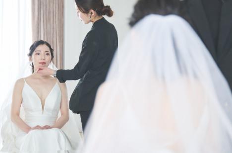 ウェディングホテルならではの広々としたお支度部屋でゆっくりとお仕度を行うことができます。お二人は、天空のチャペルで挙式前にファーストミートがあったため、新郎様と新婦様は別々のお部屋でお仕度を行いました。当日、プロのカメラマンも貸切っている為、お仕度シーンのお写真も全面鏡で撮影を行うことができました。