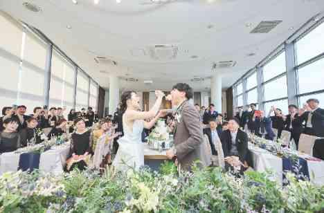自然がお好きなお二人は装飾に緑をメインにデザインされました。ホワイト・ブラウン・ゴールドを基調とした披露宴会場のため、ご新郎ご新婦様の大好きな装飾の装飾を実現することができ、ゲストの皆様もお二人らしさにたくさん写真撮影されていました。ゲストの皆様との距離が近い披露宴会場でファーストバイトのときには思わずお二人の元へゲストの皆様が寄っていく姿も見受けられました。