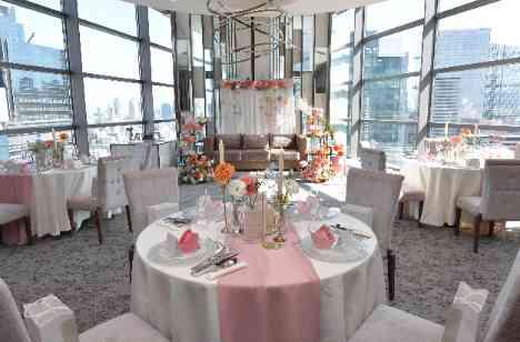 ご新婦様の理想の披露宴会場にするために何度もお打ち合わせを重ね、実現した披露宴会場 メイン席をソファーに変更し、細部まで可愛くこだわった装飾はゲストの皆様に大反響でした。ゲストテーブルにもワンポイントのランナーを入れることによって披露宴会場にご入場されてからゲストも大盛り上がりでした。 180度全面ガラス張りだからこそ生まれる光と装飾のコラボレーションがさらに会場をきれいにします。