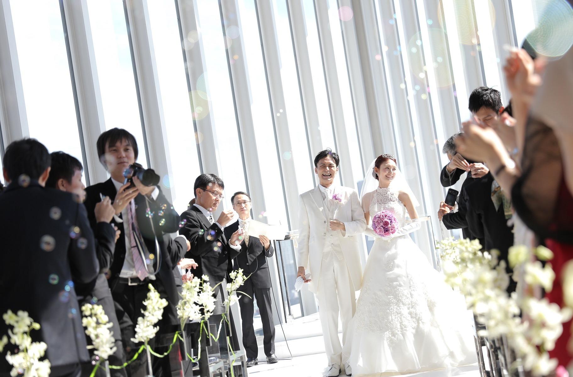 お二人の出会いは飛行機の中でした。空で出会ったお二人は、永遠の誓いも天空のチャペルで。 「青空と光に照らされた会場で、人前式はゲストに背を向けることはほとんどなく笑顔を見ながら挙式を挙げられたのでとても幸せな時間でした。」