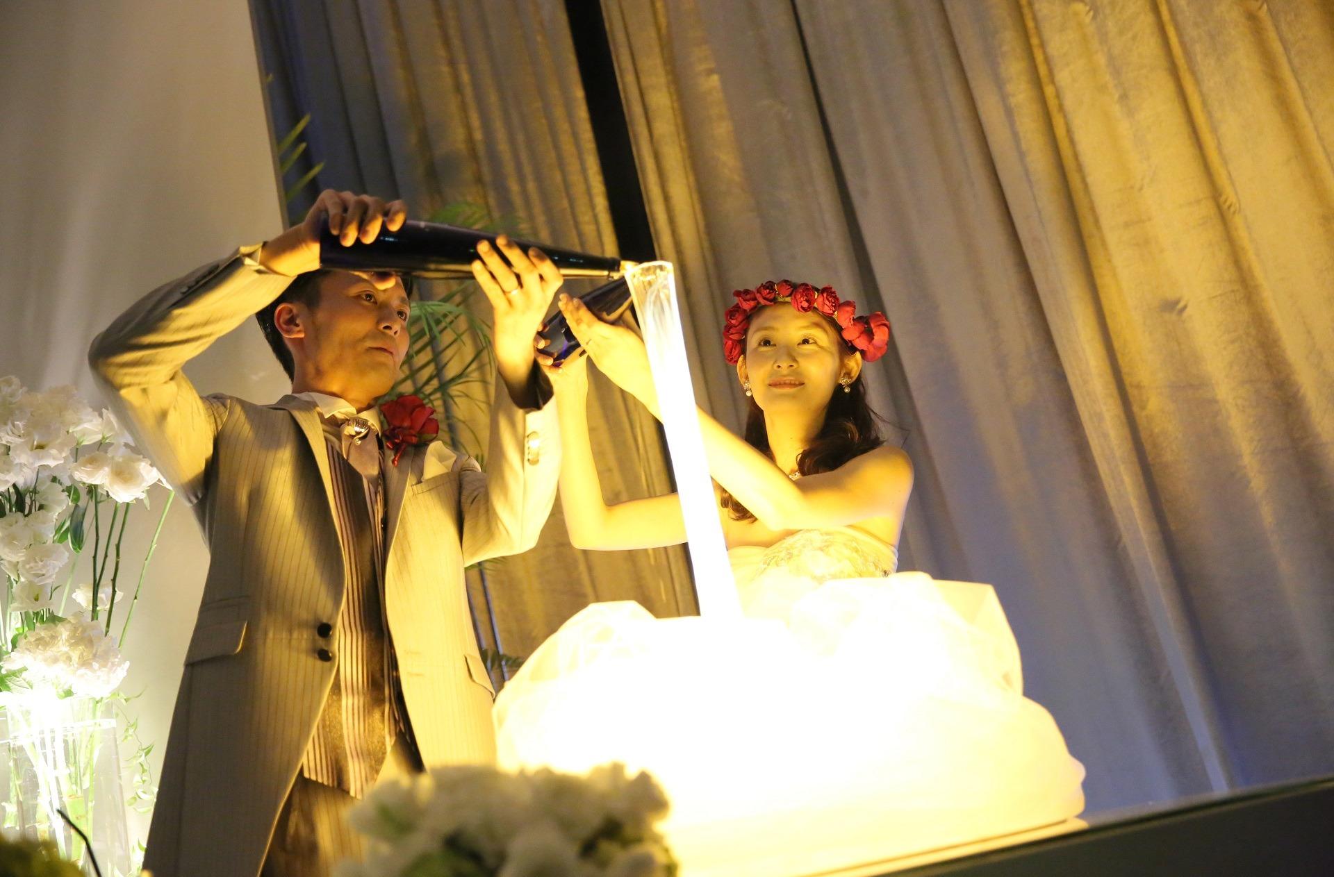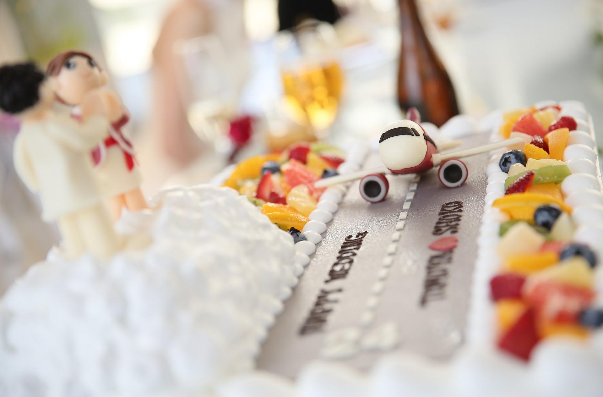 披露宴では、飛行機をテーマにウエディングケーキを作成!お二人は機内で偶然出会い、また同じ機内でのサプライズプロポーズを経て結婚へと至りましたので、お二人にとって特別な思い出が詰まった大切な場所をケーキに表現しました。それだけではなく、お二人のお名前入りの滑走路と、CAのコスチュームを着た花嫁様とタキシードを着た新郎様の人形も♪お二人の思い出が形となった、素敵なウエディングケーキとなりました。