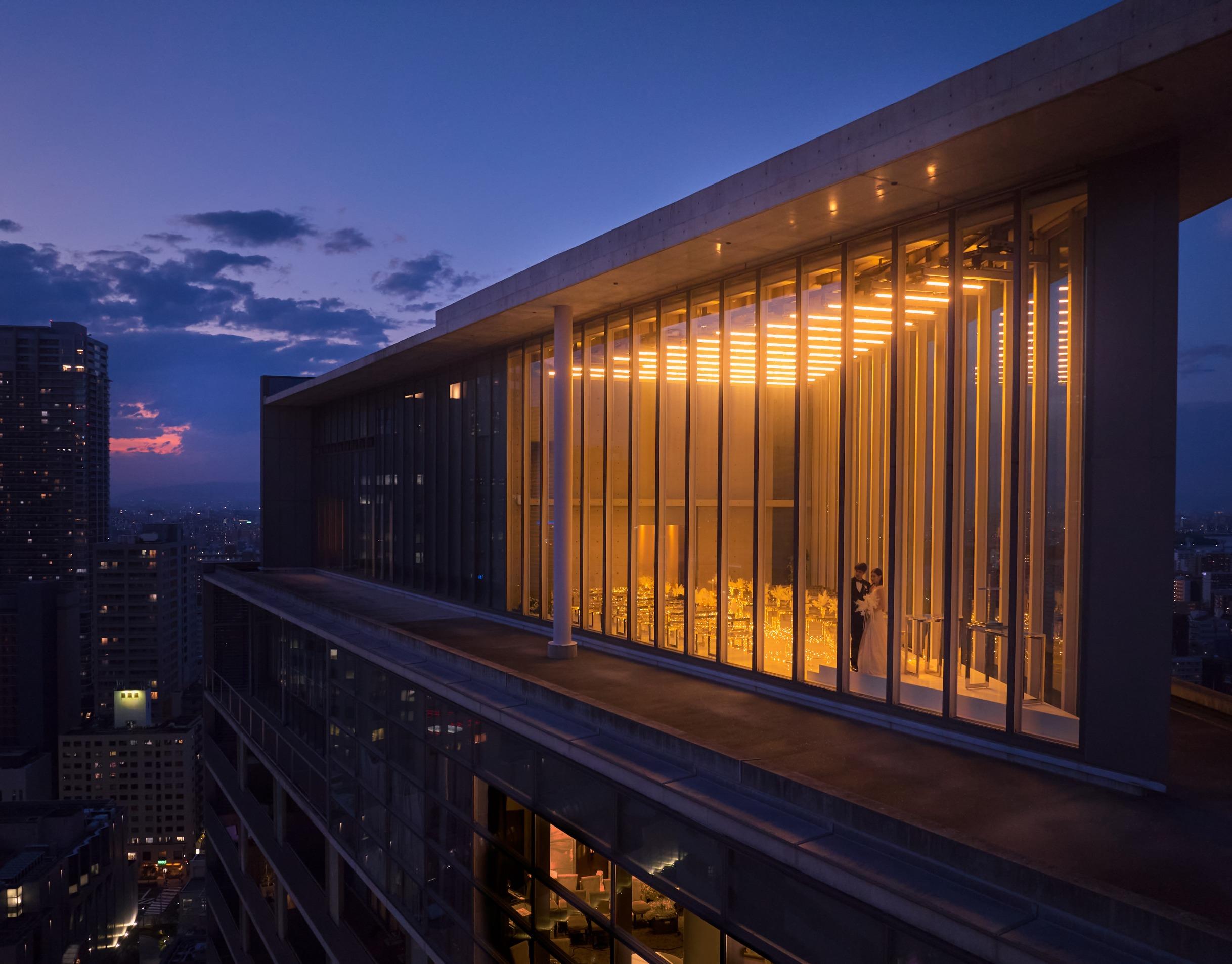 【22階】大阪を一望できる大人気の絶景パーティー会場。白を基調とした明るくシンプルで上質な空間は、どんな装飾もマッチする。好みの装飾でふたりらしさを表現しよう。【50~100名様】