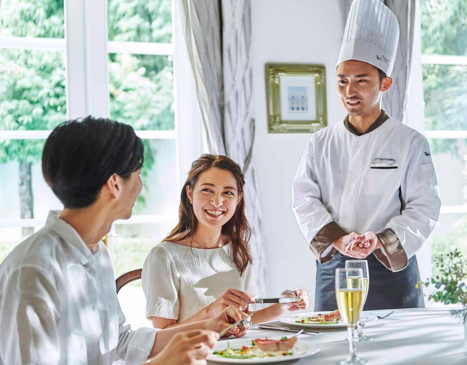 季節に合わせ旬の食材を仕入れるハイレベルなフレンチは、料理やおもてなしを重視するカップルに選ばれている。食材は産地にこだわりセレクト。シェフとの打ち合わせでおふたりだけの特別メニューを作ることも可能。