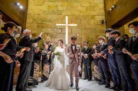 当館のチャペルはブラウンを基調としており、ゲストの方の椅子も同じくブラウン調です。温かみのある雰囲気ではある一方で、厳かな雰囲気を作り出す事も出来る空間です。その為挙式後のゲストの方々によるフラワーシャワーの祝福を受けた新郎新婦様の表情には、挙式の緊張感を終えた安堵の様子が伺えます。またチャペル内における演出の為、雨天時においても問題なく執り行う事が可能です。
