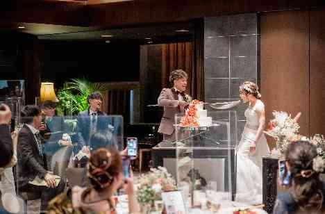 一般的に多いファーストバイトの形としては、新郎様から新婦様へは小さいスプーンでケーキをバイトし、新婦様から新郎様へはビッグスプーンでケーキをバイトする形が多いのですが、今回は新郎様から新婦様へのバイトの際にビッグスプーンを使用しました。ビッグスプーンに乗せた僅かなケーキの量にゲストの方々の笑い声が披露宴会場を包み込みました。