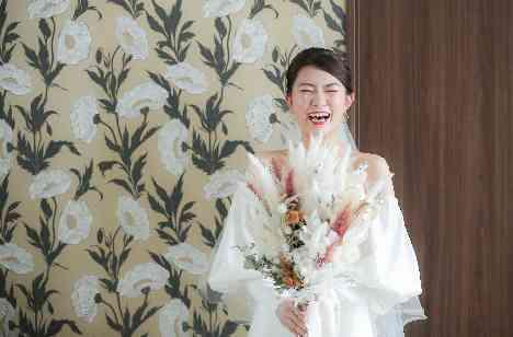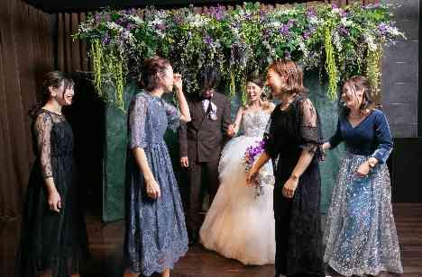こちらのお二人は会場装飾に特に力を入れておりました。披露宴会場内に担当のフラワーコーディネーターが作成したオリジナルウォールを設置し、その前でゲストの方々との写真撮影を。披露宴会場内の写真は一般的にはお二人の席の元で撮影する事が多いのですが、普段とは違う写真を撮影する事で参加ゲストの方々にとっても記憶に残る演出となります。