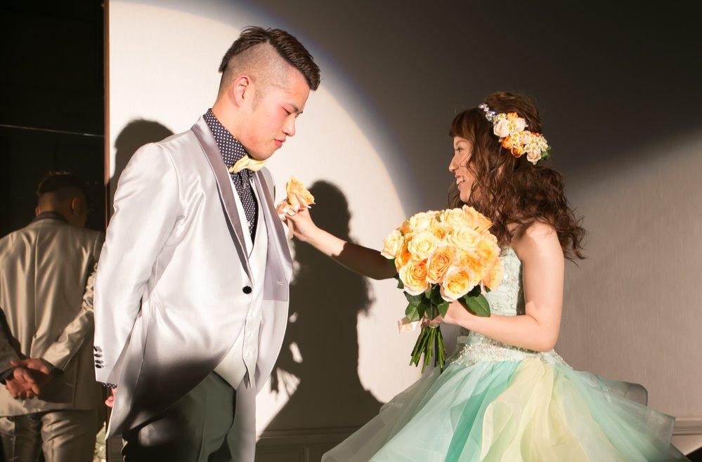 お色直しは新郎様がゲストの皆さんからお花を集めながらラウンド。できあがったブーケをもってお迎えに!!みんなの前で公開プロポーズです!! そのあとは光の演出やドレスの色当てクイズで最後まで楽しい時間となりました!