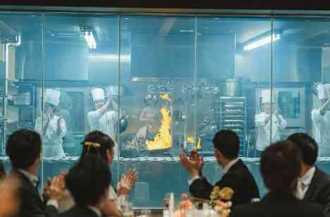 披露宴を開宴するにあたり、キッチンオープンの演出をいれました。炎が上がる演出はゲストから歓声が上がり、スタッフも一緒になって披露宴を盛り上げてくれます。この後、すぐ隣のキッチンから、出来立てのお料理をゲストに届けてもらいました。お料理の温度が高い状態で届けられるので、ゲストからの評判がとてもよかったです。