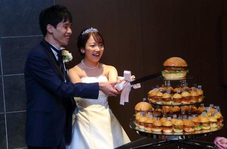披露宴には定番のケーキ入刀ですが、新郎様がケーキが苦手…ということで別の入刀できるものをご相談! 大きいお肉? オムライス? …いや、ハンバーガーで!! と、見た目もかわいいハンバーガータワーに決定! ゲストの皆様への提供用のミニバーガーには旗を差し、最後には全員参加のゲームも!大盛り上がりでしたね!