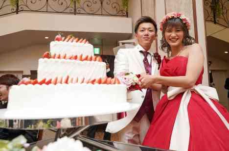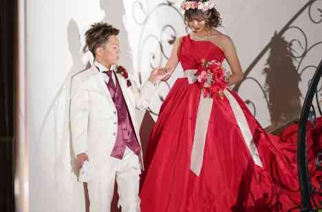 赤色が好きなご新郎ご新婦様!! ご新婦様、お色直しのカラードレスは、もちろん赤をチョイス!!そして、ご新郎様にエスコートしていただきながら、階段からのご入場!!素敵なドレスが映える階段からの入場は、まるで映画のワンシーンかのように!!