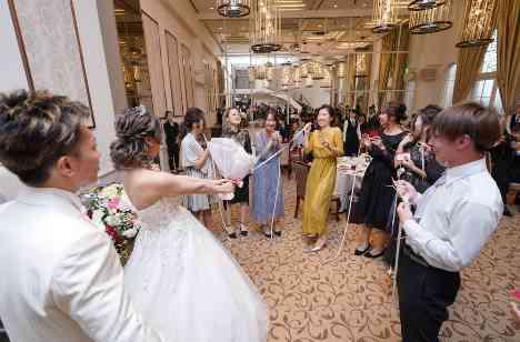 未婚の女性ゲストの方が多かった為、 披露宴中に盛り上がる演出として、幸せになってほしい女性の皆様+男性の方を呼び出し、ブーケプルズを行いました!!ブーケをゲットした女性は大喜び!!新婦様から幸せのおすそ分けです!!