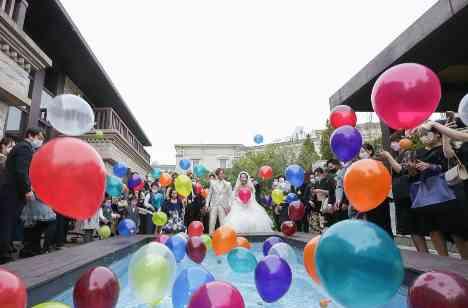 挙式が結び、ご披露宴が始まるまでのウェルカムパーティーにて、ブライダルフェアの際にご案内させていただいたバルーン演出【ドロップ&フライ】を結婚式で実現いただきました。2段階で楽しんでいただける演出なのでシャッターチャンスも多く、ゲストの方皆様に楽しんでいただきました。カラフルな風船が空いっぱいに広がり、素敵なワンシーンに♪